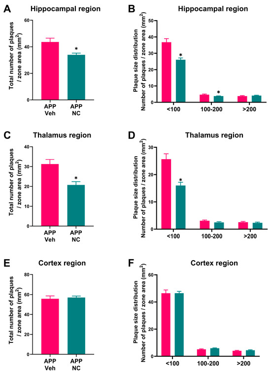 Quantitative analysis of amyloid plaques in the hippocampus, thalamus, and cortex regions of APP/PS1 and APP/PS1-NC mice. (A) The total number of amyloid plaques in the hippocampus of APP/PS1-NC and APP/PS1 mice. (B) Hippocampal amyloid plaques of various size categories. (C) The total number of amyloid plaques in the thalamus of APP/PS1-NC and APP/PS1 groups. (D) Thalamic plaque density analysis of various size categories in NC-treated and untreated mutants. (E) The total number of amyloid plaques in the cortex of APP/PS1-NC and APP/PS1 groups. (F) The cortical amyloid plaque density did not show significant differences in any size cat of various sizes. APP Veh = APP/PS1, APP NC = APP/PS1-NC. Data are presented as mean ± SEM. * p < 0.05, Welch’s t-test.