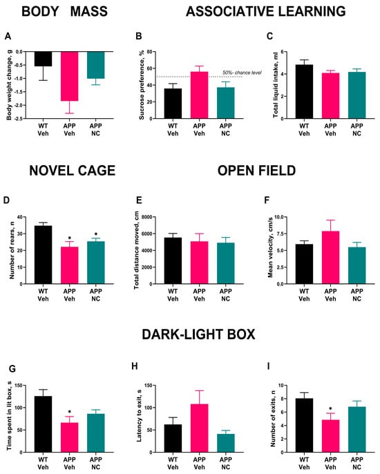 Behavioral changes in APP/PS1 mutants and effects of NC administration. (A) Body weight changes in APP/PS1 and APP/PS1-NC mice. (B) Acquisition of associative memory in the conditioned taste aversion test in WT, APP/PS1-NC and APP/PS1 groups of mice. (C) Total liquid intake in experimental groups of mice in the conditioned taste aversion test. (D) Rearing events in the novel cage test displayed by WT, APP/PS1 and APP/PS1-NC mice. (E) Total distance traveled and (F) mean velocity in the open field test scored in WT, APP/PS1 and APP/PS1-NC mice. (G) Time in the lit compartment of the dark–light box test spent by experimental groups of mice. (H) The latency to exit to the lit box shown by WT, APP/PS1 and APP/PS1-NC mice. (I) Number of exits to the lit compartment in WT, APP/PS1 and APP/PS1-NC groups of WT Veh = WT, APP Veh = APP/PS1, APP-NC = APP/PS1-NC. Statistical significance was evaluated as indicated for each test (see MS text) with * p < 0.05 vs. WT, * p < 0.05 vs. random level (50%). All data are presented as mean ± SEM.