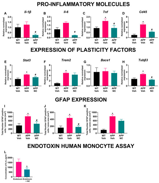 Anti-inflammatory effects of NC in vivo and in vitro. Gene expression in the prefrontal cortex of WT, APP/PS1 and APP/PS1-NC groups of (A) Il-1β, (B) Il-6, (C) Tnf, (D) Cd45, (E) Stat3, (F,G) Bace1 and (H) Tubβ3. (I) The density of GFAP-positive cells in the hippocampus of WT, APP/PS1 and APP/PS1-NC mice. (J) The density of GFAP-positive cells in the thalamus of WT, APP/PS1 and APP/PS1-NC mice. (K) The density of GFAP-positive cells in the cortex of WT, APP/PS1 and APP/PS1-NC groups. (L) In vitro effects of NC pre-incubation on IL-6 release from endotoxin-stimulated human monocytes. WT Veh = WT, APP Veh = APP/PS1, APP-NC = APP/PS1-NC. Statistical significance was evaluated as indicated for each test with * p < 0.05 vs. WT, # p < 0.05 vs. APP/PS1, § p < 0.05 vs. Endotoxin group. All data are presented as mean ± SEM.