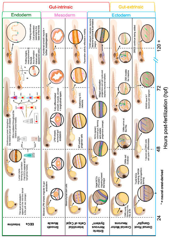 - Kuil, L.E.; Chauhan, R.K.; Cheng, W.W.; Hofstra, R.M.W.; Alves, M.M. Zebrafish: A Model Organism for Studying Enteric Nervous System Development and Disease. Front. Cell Dev. Biol. 2020, 8, 629073. [Google Scholar] [CrossRef] [PubMed]