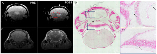 To confirm these observations in vivo, USPIO-EVs were i.n. administered in healthy control mice and EAE mice one day after disease onset and visualized by MRI 3 h post-treatment. The signal was detected in the brain during EAE, preferentially located in positive for Gd-based contrast agent-inflamed areas (Figure 2A,C). No specific signals were observed in healthy mice, as demonstrated by our previous publication [34]. Congruently, histological analysis by Prussian Blue staining confirmed imaging data showing the presence of positivity in the same areas revealed by MRI (Figure 2B).