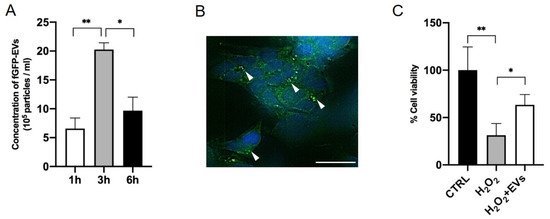 To evaluate the capability of fGFP-EV migration across the epithelium reaching injured sites, we set up a transwell system similar to the one previously described, in which the bottom of the chamber was seeded with oxidative-stressed SH-SY5Y cells. After fGFP-EV seeding on the RPMI 2650 layer, NTA analysis of the below medium was performed at different timings. A significant increase of fGFP-EVs detected from 1 to 3 h indicated the ability of fGFP-EVs to cross the epithelium in a time-dependent manner. Although after 6 h of treatment, the amount of fGFP-EVs was reduced in the supernatant (Figure 3A), at this time point, we found the presence of green fluorescent spots inside SH-SY5Y cells, suggesting that EVs were internalized by the damaged cells (Figure 3B). Of note, fGFP-EVs endocytosis correlated with increased neuronal rescue. The viability of SH-SY5Y cells was, indeed, significantly improved in the presence of fGFP-EVs (p = 0.0464) if compared to oxidative stress-induced SH-SY5Y cells cultured in the absence of fGFP-EVs (Figure 3C). These data indicate that cellular stress signals could induce fGFP-EV migration through the epithelial layer and their subsequent SH-SY5Y cell internalization with a neuromodulatory outcome.
