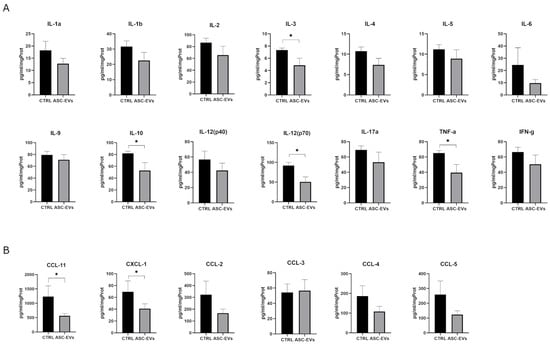 Cytokine and chemokine detection. Multiplex analysis of (A) cytokines and (B) chemokines detected in spinal cord homogenates of EAE mice treated with ASC-EVs and PBS-injected controls. The protein concentration of the molecules is expressed as pg/mL/mg of the total protein content. Data are represented as the mean ± SEM of one representative experiment from a series of two similar results for n = 5 mice/condition by Mann–Whitney test (* p < 0.05).
