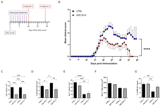 Clinical and neuropathological assessment of daily ASC-EV i.n. administration in EAE mice. (A) Schematic representation of experimental protocol. (B) Clinical score of MOG35-55 induced EAE mice treated i.n. with PBS (vehicle) or with ASC-EVs. Mice were, one at a time, i.n. treated at EAE onset and individually sacrificed once the experimental endpoints were achieved. Data are represented as the mean ± SEM of 13 mice/condition. Two-tailed Kolmogorov–Smirnov test was used (**** p = 0.0001). Quantification and histological analysis for (C) CD3+ cells, (D) demyelination (Woelcke staining), (E,F) Iba-1+ cells and (G) SMI-32 one day after the last administration (endpoint 1), or 10 days later (endpoint 2). Data are represented as the mean ± SEM of 3 mice/condition (* p < 0.05, ** p < 0.001, *** p < 0.0005, **** p < 0.0001). Representative images are reported in Supplementary Figure S5.
