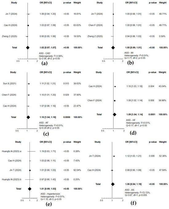| Jin et al. (2024) [43] | European | iPSYCH-PGC (ASD); Nielsen et al. (2018) [55] (AF); Malik et al. (2018) [54] (AS, AIS, LAS, CES, SVS); van der Harst and Verweij (2018) [53] (CAD); Dönertaş et al. (2021) [56] (MI, hypertension) | two-sample MR | ASD | 18,382 | 27,969 | AF | 60,620 | 970,216 | 1.082 (1.0019–1.1684) * | Causal relationships between ASD and AS, IS, LAS, and HF |