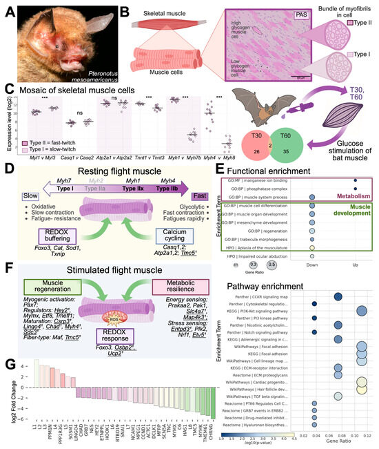 Pteronotus as a model for flight muscle specialization and stress resilience. (A) Photo of P. mesoamericanus, a Neotropical mustached bat specialized for high-speed, high-endurance flight. (B) Schematic of skeletal muscle highlighting a mosaic of fast-twitch (Type II) and slow-twitch (Type I) muscle fibers. Periodic Acid-Schiff (PAS) staining reveals high and low glycogen-content across muscle fibers. Skeletal muscle tissue (pectoralis) was sampled at three timepoints: control animals (n = 4) represent the baseline state (T0), while glucose-fed animals were sampled at 30 (T30; n = 3) and 60 (T60; n = 5) minutes post-glucose intake. RNA-seq was performed on flight muscle to identify differentially expressed genes (DEGs) in response to glucose. The Venn diagram shows overlap of DEGs between T30 vs. T0 and T60 vs. T0. (C) Expression of muscle fiber-type genes across 13 individuals, comparing fast-twitch (dark purple) and slow-twitch (light purple) paralogs. Candidate genes include myosin heavy chains (Myh1, Myh4, Myh7, Myh8), myosin light chains (Myl1, Myl3), calsequestrins (Casq1, Casq2), calcium ATPases (Atp2a1, Atp2a2), and troponin T (Tnnt3, Tnnt1). Horizontal line indicates median; statistical comparisons were performed using paired t-tests. *** p < 0.001. (D) Summary diagram of resting flight muscle gene expression at baseline. The pectoralis has mosaic fiber types, ranging from slow-twitch oxidative (Type I, Myh7) to fast-twitch glycolytic (Type IIb, Myh4), and intermediate fast-twitch oxidative-glycolytic fibers (Type IIx, Myh1). At rest, flight muscle is enriched for genes involved in redox buffering (Foxo3, Cat, Sod1, Txnip) and calcium handling (Casq1/2, Atp2a1/2, Tmc5†). † indicates DEGs with p < 0.003 and log2 fold change > 1.5. (E) Gene set enrichment analysis (GSEA) for T30 vs. T60. Dot plots show top enriched terms from KEGG, Reactome, Panther, and WikiPathways. Circle size reflects gene ratio; color indicates −log10 (p-value). Directionality refers to changes relative to T30: “Up” = higher expression in T60, “Down” = lower. The top functional terms were associated with muscle metabolism and development. (F) Summary diagram of glucose-stimulated gene expression, grouped by functional modules. Regeneration signaling includes myogenic activation (Pax7), regulators (Mymx, Hey2†, Etf8, Tmeff1), maturation (Lingo4†, Chad†, Csrp3†, Myh4†), and fiber-type specification (Maf, Tmc5†). Metabolic resilience includes energy sensing (Prkaa2, Pak1, Slc4a7†, Map4k3†) and stress signaling (Etv5†, Plk2, Nrf1). Redox response includes Foxo3, Osbp2†, and Ucp2†. (G) Log2 fold change in gene expression for T60 relative to T30. All data marked with † are significant from RNA-seq differential expression analysis. n denotes number of biological replicates. ns = not significant.