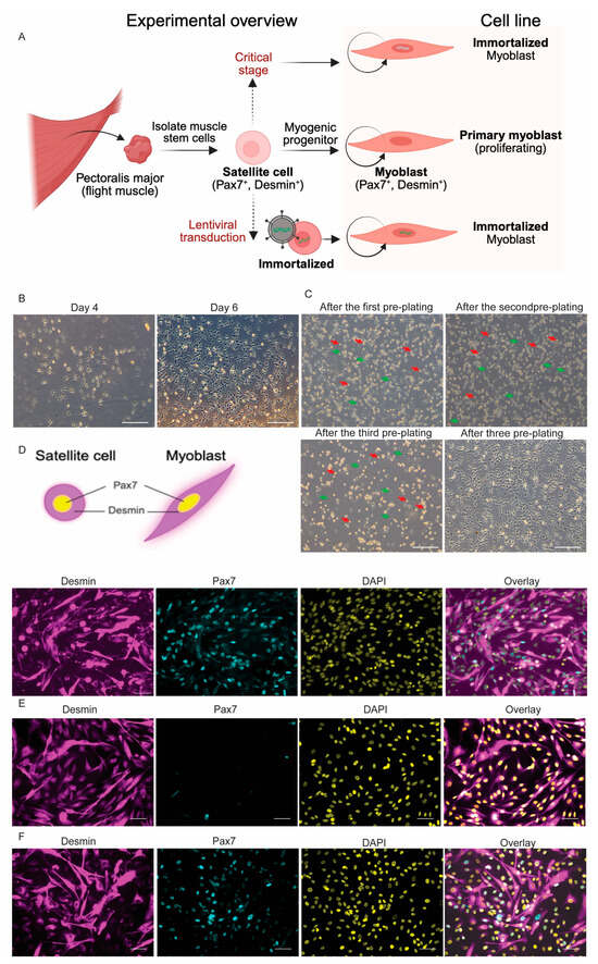 Bat primary myoblast isolation and myoblast verification. (A) Summary of the development and characterization of myoblast cell lines. (B) Primary muscle cells at 4-day and 6-day post-derivation. (C) Representative phase-contrast images showing the muscle cells at different stages of pre-plating. Green arrow: attached cells; red arrow: cells in suspension. (D–F) Immunofluorescent staining of DESMIN (magenta) and PAX7 (cyan) with DAPI counterstain (yellow) of P. mesoamericanus primary myoblasts, P9 (D), iBatM-Pmeso-S, P37 (E), and iBatM-Pmeso-TC, P37 (F). Scale bar: 50 μm.