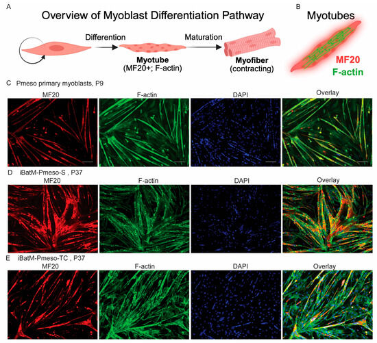 Bat Myoblast Lines Retain Differentiation Capacity. (A) Schematic overview of myoblast differentiation into multinucleated myotubes and subsequent maturation into myofibers. (B) Diagram illustrating expected colocalization of sarcomeric myosin heavy chain (MF20, red) and F-actin (green) in differentiated myotubes. (C–E) Immunofluorescent staining of myosin heavy chain (MF20; red), F-actin (green), and nuclei (DAPI; blue), with merged overlays to the right. (C) P. mesoamericanus myoblasts at passage 9 (P9) exhibit robust differentiation with organized, striated F-actin consistent with sarcomeric structure. (D) iBatM-Pmeso-S (P37) displays irregular, punctate F-actin patterns with less consistent alignment, suggesting impaired cytoskeletal maturation despite MF20 expression. (E) iBatM-Pmeso-TC (P37) shows improved F-actin organization and greater alignment compared to iBatM-Pmeso-S, more closely resembling the sarcomeric pattern observed in primary cells. Scale bar: 100 μm.
