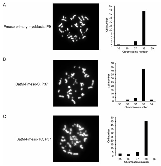 Bat Myoblast Lines Retain Genetic Stability After Extended Passaging. (A). Representative chromosome spread and count distribution for P. mesoamericanus primary myoblasts (Pmeso) at passage 9. A total of 49 metaphase spreads were analyzed, with a diploid karyotype of 2n = 38. (B). Representative chromosome spread and counts for iBatM-Pmeso-S at late passage (P37). Of 50 metaphase spreads, most maintained the expected diploid number (2n = 38), indicating genomic stability despite extended culture. (C). Representative image of chromosome spread and chromosome counts for iBatM-Pmeso-TC at P37. Among 55 metaphase spreads, the majority maintained 2n = 38, consistent with long-term karyotypic stability. Images were taken at 40× magnification.