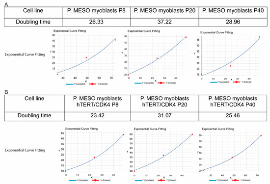 Spontaneous and hTERT/CDK4 Immortalization Support Long-Term Proliferation. (A). Doubling time and exponential curve fitting for spontaneously immortalized myoblasts iBatM-Pmeso-S at passages 8 (P8), P20, and P40, demonstrating the bypass of senescence. (B). Doubling time and exponential growth curve fitting for hTERT/CDK4-immortalized myoblasts iBatM-Pmeso-TC at P8, P20, and P40, showing stable proliferation. Doubling Time Computing software: https://www.doubling-time.com/compute_more.php (accessed on 5 May 2025).
