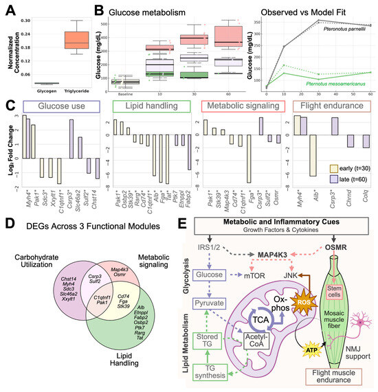 Integrated molecular, physiological, and functional adaptations in flight muscle. (A). Normalized concentrations of glycogen and triglycerides measured in P. parnellii pectoralis muscle, showing preferential storage of triglycerides. (B). Glucose tolerance test (GTT) time series and linear mixed model fit. Left: Blood glucose levels measured at baseline, 10, 30, and 60 min after oral glucose administration across individual bats (n = 36). P. mesoamericanus (green) shows a uniformly low response, whereas P. parnellii exhibits both high (red) and low (gray) glucose clearance phenotypes. Right: Linear mixed-model fit to the GTT time series. Solid lines represent observed species means; dotted lines indicate the model-predicted trajectories. The model shows a significant species × time interaction (p < 0.001) in glucose clearance for P. mesoamericanus (green, n = 10) and P. parnellii (dark gray, n = 26). (C). Log2 fold change in gene expression for differentially expressed genes (DEGs) in flight muscle at 30 min (yellow) or 60 min (purple) post-glucose administration compared to baseline (0 min). Only DEGs with |log2FC| > 1.5 and adjusted p-value < 0.01 (EdgeR) are shown. Genes are grouped into four functional modules: Glucose use, lipid handling, metabolic signaling, and flight endurance based on enrichment clustering using g:Profiler-enriched terms. Genes with (*) are shared in different modules. Module-specific DEGs include Chst14, Slc46a2, Xxylt1 (glucose handling), and Osbp2, Ptk7, Etnppl, and Fabp2 (lipid handling), highlighting metabolic specialization in bat flight muscle. (D). Venn diagram illustrating the overlap of DEGs across three functional modules: Carbohydrate Utilization, lipid handling, and metabolic signaling. Genes in overlapping regions are implicated in multiple pathways. Notably, Map4k3 and Osmr are uniquely assigned, representing upstream metabolic and cytokine signaling inputs. (E). Schematic of core cellular metabolic pathways supporting flight muscle performance. The illustration highlights the integrated metabolic and structural adaptations required for powered flight. The conceptual model incorporates well-established molecules in glucose metabolism, lipid handling, mitochondrial ATP production, and neuromuscular activity, based on general principles of cell biology. Solid arrows represent direct metabolic inputs; dotted arrows indicate indirect regulatory inputs. Growth factors and cytokine signals act through receptors IRS1/2 and OSMR, which activate downstream protein MAP4K3. These signaling pathways converge on mTOR and JNK proteins to regulate cellular metabolic and stress responses. Pyruvate-derived acetyl-CoA is routed either to the TCA cycle or triglyceride (TG) synthesis. Stored TG serves as an energy reservoir for mitochondrial energy production. ATP fuels neuromuscular junction (NMJ) activity and contraction, supporting muscle endurance. In parallel, OSMR contributes to regenerative signaling, consistent with muscle stem cell activation.