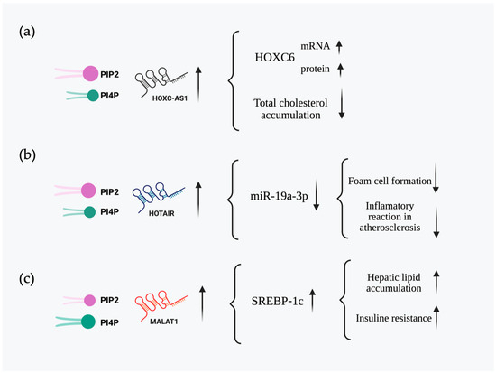 Figure 1. LncRNAs involved in lipid metabolism identified in a database of RNAs interacting with PIP2 and PI4P. On the left side of each panel, the specific phosphoinositide with which each lncRNA interacts is indicated, as well as their relative binding affinity, represented by the larger lipid icon corresponding to the stronger interaction. The lncRNAs shown with their corresponding influence in the lipid metabolism are: (a) HOXC-AS1, (b) HOTAIR, and (c) MALAT1.
