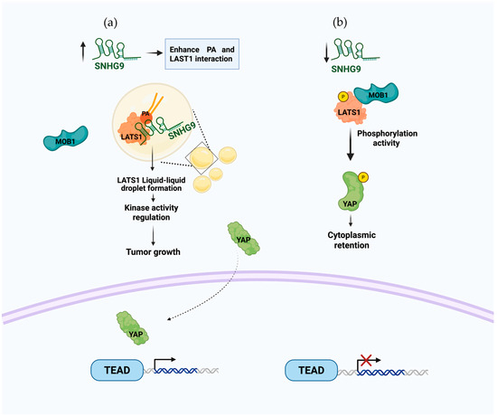 A complex formation of RNA−lipid-protein is a mechanism also seen with the lncRNA SNHG9 that has a direct interaction with PA and the protein LATS1, promoting the phase separation of this protein, which affects the availability of LATS1 and inhibits the Hippo pathway, which is key to the regulation of cell proliferation [55]. In this pathway, the yes-associated protein (YAP) is phosphorylated by LATS1 and retained in the cytoplasm instead of translocating to the nucleus (Figure 3b). SNHG9 interaction with the PA of LATS1 plays a tumor-promoting role by affecting LATS1 phosphorylation by MOB1 and the subsequent phosphorylation of YAP. This interaction promotes the LLPS (Figure 3a) and inhibits LATS1 kinase activity, resulting in a non-phosphorylated YAP that is now able to translocate to the nucleus and associate with TEAD transcription factors [55].