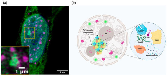 Figure 4. (a) FISH assay of HANR and PIP2 immunolocalization in U2OS cells (modified from Bayona-Hernandez, 2024) and (b) a model of HANR accumulation within perinucleolar compartments, where it colocalizes with PIP2 as well as with several key proteins, including MED1, SON, and hnRNPI.