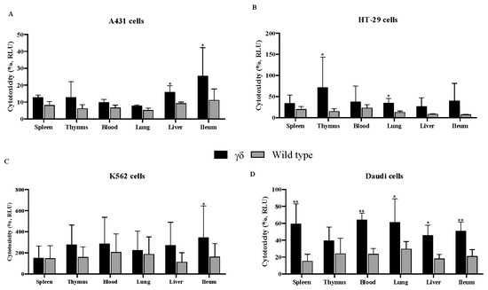 Humanized T cell receptor (HuTCR)-T1 gamma delta (γδ) mice exhibited greater cytotoxic effect. γδ T cells were co-cultured with human cancer cells [A431 (A), HT-29 (B), K562 (C), and Daudi (D)] at the ratio of 1:10 in the presence of α-galactosylceramide (α-GalCer) for 24 h. Cytotoxicity assay was performed using lactate dehydrogenase assay. Differences between the two groups were analyzed by two-way ANOVA followed by Bonferroni post-test. Mean numbers from four independent experiments are reported as ± SEM (n = 12). Humanized mice γδ T cells were compared with wild-type γδ T cells; * p < 0.05, and ** p < 0.01 were considered statistically significant.