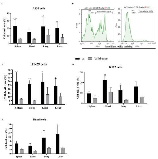 Humanized T cell receptor (HuTCR)-T1 gamma delta (γδ) mice exhibited greater apoptotic effect. γδ T cells were co-cultured with human cancer cells [A431 (A,B), HT-29 (C), K562 (D), and Daudi (E)] at the ratio of 1:10 in the presence of α-galactosylceramide (α-GalCer) for 24 h. Cell death assay was performed using propidium iodide (PI) staining. Differences between the two groups were analyzed by two-way ANOVA followed by Bonferroni post-test. Mean numbers from four independent experiments are reported as ± SEM (n = 12). Humanized mice γδ T cells were compared with wild-type γδ T cells; * p < 0.05, ** p < 0.01, and *** p < 0.001 were considered statistically significant.
