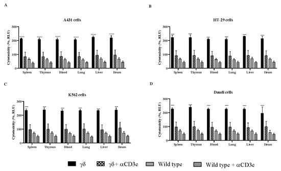 αCD3e abrogated the effect of gamma delta (γδ) T cells. γδ T cells were co-cultured with human cancer cells [A431 (A), HT-29 (B), K562 (C), and Daudi (D)] at the ratio of 1:10 in the presence of α-galactosylceramide (α-GalCer) and αCD3e for 24 h. Cytotoxicity assay was performed using the lactate dehydrogenase in the cell culture media. Differences between the two groups were analyzed by two-way ANOVA followed by Bonferroni post-test. Mean numbers from four independent experiments are reported as ± SEM (n = 12). Humanized mice γδ T cells were compared with wild-type γδ T cells; **** p < 0.0001.