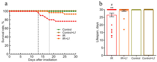 3.1. Treatment with Lf Increased the Survival Rate and the Mean Lifespan of Irradiated Mice During the Experiment (30 Days)