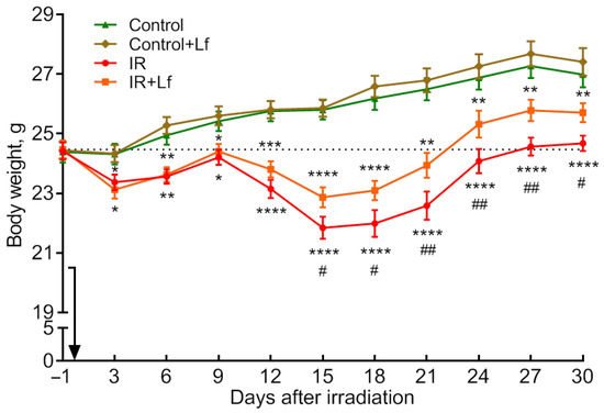 3.2. The Positive Effect of Lf on the Dynamics of Body Weight Recovery in Irradiated Mice