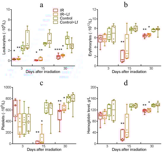 - Kopaeva, M.Y.; Alchinova, I.B.; Nesterenko, M.V.; Cherepov, A.B.; Zarayskaya, I.Y.; Karganov, M.Y. Lactoferrin beneficially influences the recovery of physiological and behavioral indexes in mice exposed to acute gamma-irradiation. Patogenez. Pathog. 2020, 18, 29–33. (In Russian) [Google Scholar] [CrossRef]