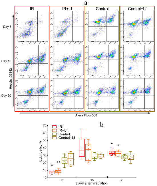 3.5. Dynamics of the Number of EdU+ Cells in the Bone Marrow of Irradiated Mice
