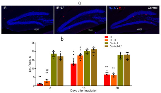 - Kopaeva, M.Y.; Cherepov, A.B.; Zaraiskaya, I.Y. Lactoferrin Has a Protective Effect on Mouse Brain Cells after Acute Gamma Irradiation of the Head. Bull. Exp. Biol. Med. 2023, 176, 246–252. [Google Scholar] [CrossRef] [PubMed]