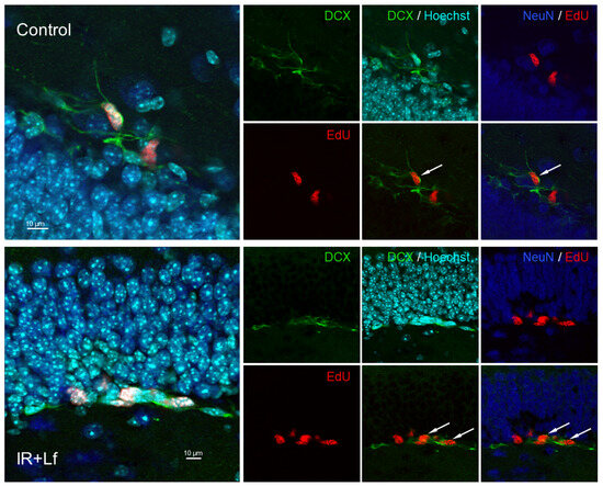 - Tada, E.; Parent, J.M.; Lowenstein, D.H.; Fike, J.R. X-Irradiation Causes a Prolonged Reduction in Cell Proliferation in the Dentate Gyrus of Adult Rats. Neuroscience 2000, 99, 33–41. [Google Scholar] [CrossRef] [PubMed]