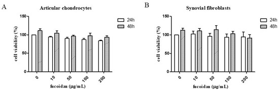 The MTT assay results showed that fucoidan did not significantly affect cell survival at concentrations from 0 to 200 μg/mL in either primary human articular chondrocytes (Figure 1A) or synovial fibroblasts (Figure 1B).