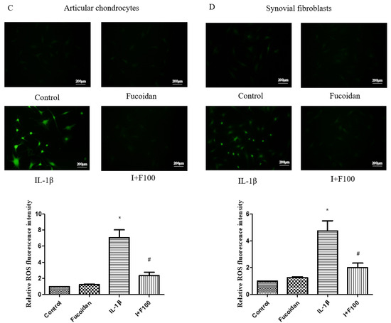 The results show that stimulation with 1 ng/mL of IL-1β significantly increased ROS production by 5.26 ± 0.57-fold (n = 4, p < 0.01) in articular chondrocytes (Figure 1C) and by 4.98 ± 0.91-fold (n = 4, p < 0.05) in synovial fibroblasts (Figure 1D) compared to the control group. However, co-incubation with fucoidan markedly suppressed IL-1β-induced ROS generation in a dose-dependent manner.