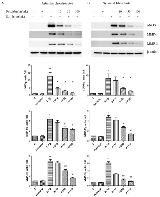 The effects of fucoidan on IL-1β-induced i-NOS, MMP-1, and MMP-3 protein expression and NO production in articular chondrocytes and synovial fibroblasts. (A,B) Upregulation of i-NOS, MMP-1, and MMP-3 induced by IL-1β was suppressed by fucoidan treatment in articular chondrocytes and synovial fibroblasts. (C,D) Griess reaction. Upregulation of nitrite production induced by IL-1β was suppressed by fucoidan treatment in articular chondrocytes and synovial fibroblasts (* p < 0.05 compared with control; ** p < 0.01 compared with control; # p < 0.05, IL-1β vs. I+F100; ## p < 0.01, IL-1β vs. I+F100).