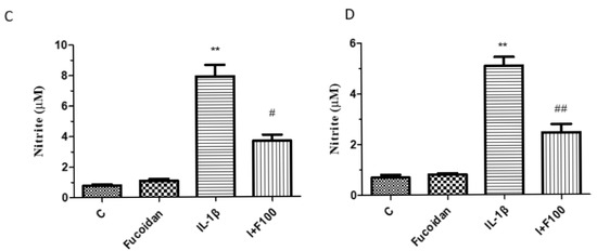 Similarly, IL-1β stimulation significantly increased the expression of matrix metalloproteinases (MMP-1 and MMP-3) in both cell types. In articular chondrocytes, the MMP-1 and MMP-3 expression levels increased by 4.33 ± 0.76-fold (n = 4, p < 0.05) and 4.93 ± 0.64-fold (n = 4, p < 0.01), respectively (Figure 2A). In synovial fibroblasts, they increased by 4.69 ± 0.75-fold (n = 4, p < 0.05) and 6.15 ± 0.57-fold (n = 4, p < 0.01), respectively (Figure 2B). These effects were significantly suppressed by co-incubation with fucoidan in a dose-dependent manner. Additionally, the culture medium was collected to evaluate nitrite production. IL-1β treatment significantly increased NO production to 7.94 ± 1.51 μM (n = 4, p < 0.01) in articular chondrocytes (Figure 2C) and to 5.08 ± 0.71 μM (n = 4, p < 0.01) in synovial fibroblasts (Figure 2D). Co-treatment with fucoidan effectively suppressed IL-1β-induced nitrite production in a dose-dependent manner.
