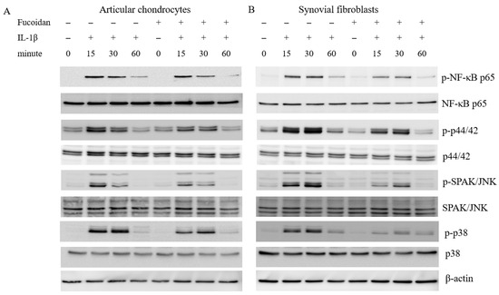 To explore the signaling pathways involved in the antioxidative effects of fucoidan on articular chondrocytes and synovial fibroblasts, we examined the activation of ERK1/2, SAPK/JNK, p38 MAP kinases, and NF-κB. Stimulation with IL-1β induced the phosphorylation of ERK1/2, SAPK/JNK, p38 MAP kinases, and NF-κB p65 for 15, 30, and 60 min in both cells. In articular chondrocytes (Figure 3A), the phosphorylation of ERK1/2, SAPK/JNK, p38, and NF-κB p65 peaked 15 min following IL-1β stimulation. In synovial fibroblasts (Figure 3B), the phosphorylation of these proteins reached its peak 30 min after IL-1β stimulation. Notably, co-incubation with fucoidan (100 μg/mL) effectively suppressed the IL-1β-induced phosphorylation of ERK1/2, SAPK/JNK, p38 MAP kinases, and NF-κB p65 in both articular chondrocytes and synovial fibroblasts.