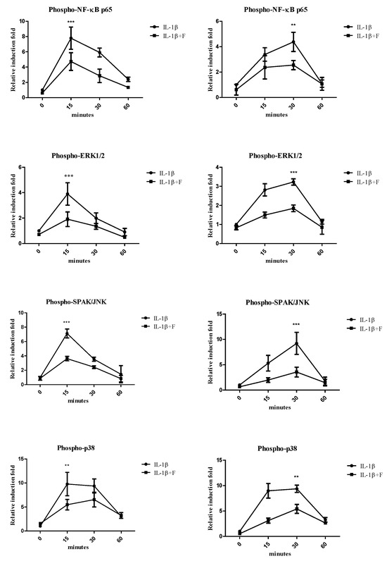 The effects of fucoidan on IL-1β-induced NF-κB activation and MAP kinases in (A) articular chondrocytes and (B) synovial fibroblasts (** p < 0.01 compared with the same minutes, IL-1β vs. I+F; *** p < 0.001, compared with the same minutes, IL-1β vs. I+F).