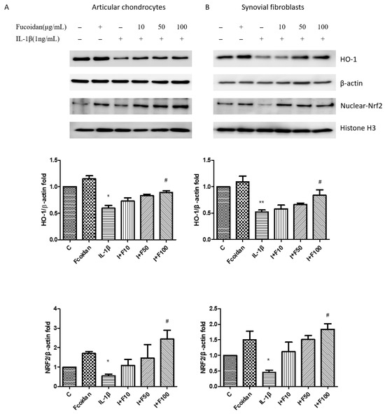 The effects of fucoidan on the IL-1β-induced HO-1/Nrf2 signaling pathway in (A) articular chondrocytes and (B) synovial fibroblasts. The downregulation of HO-1 and Nrf2 induced by IL-1β was increased by fucoidan treatment in articular chondrocytes and synovial fibroblasts (* p < 0.05 compared with control; ** p < 0.01 compared with control; # p < 0.05, IL-1β vs. I+F100).
