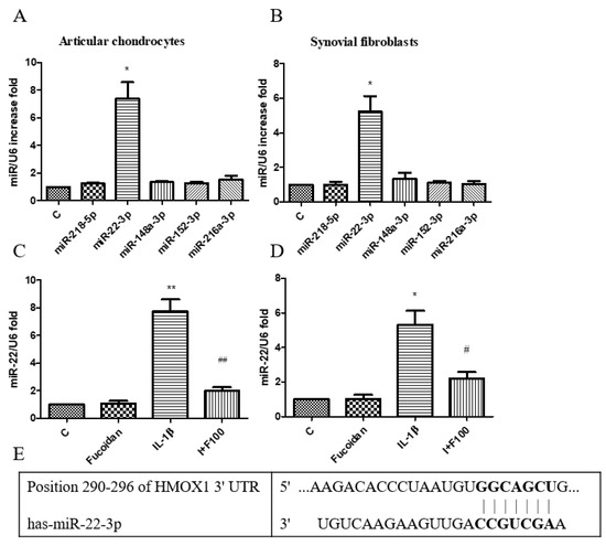 Effects of fucoidan on IL-1β-induced miR regulation in articular chondrocytes and synovial fibroblasts. (A,B) Total RNA was isolated from articular chondrocytes and synovial fibroblasts treated with IL-1β for 24 h. Real-time PCR analysis of miR-218-5p, miR-22-3p, miR-148a-3p, miR-152-3p, and miR-216a-3p expression (n = 5). (C,D) Fucoidan attenuates IL-1β-induced oxidative stress via downregulation of miR-22. Real-time PCR analysis of miR-22 in articular chondrocytes and synovial fibroblasts incubated with fucoidan in response to IL-1β (* p < 0.05 compared with control; ** p < 0.01 compared with control; # p < 0.05, IL-1β vs. I+F100; ## p < 0.01, IL-1β vs. I+F100). (E) Site of matching between HMOX-1 3′UTR and miR-22 sequences (provided by TargetScan database).