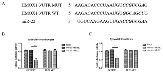 The HMOX1 3′-UTR is a direct target of miR-22 in articular chondrocytes and synovial fibroblasts. (A) The predicted miR-22 targeting site within the HO-1 3′UTR and the mutated sites aligned as indicated. (B,C) The relatives of dual luciferase activity in articular chondrocytes and synovial fibroblasts were determined after the empty pMIR reporter (Mock), wild-type 3′UTR, or mutant 3′UTR plasmids were co-transfected with the negative control or miR-22 (** p < 0.01, miR-NC vs. miR-22).