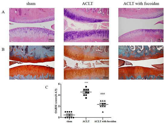 To verify the effect of fucoidan on OA development in vivo, we established an ACLT rat model. The rats were orally administered 100 mg/kg of fucoidan in ddH2O or a sham (ddH2O alone) once every 2 days for 12 weeks. Histomorphology was assessed using H&E staining (Figure 7A) and Safranin O staining (Figure 7B), and differences between the sham, ACLT, and ACLT with fucoidan groups were evaluated using the Osteoarthritis Research Society International (OARSI) score [26]. Compared to the sham control group, the OARSI score significantly increased to 4.50 ± 0.75-fold (n = 9, p < 0.001) in the ACLT group. The ACLT group exhibited cartilage denudation, erosion, and proteoglycan loss. Conversely, the ACLT group treated with fucoidan showed a smoother cartilage surface and reduced proteoglycan loss (Figure 7A,B). Furthermore, the OARSI score significantly decreased to 2.33 ± 0.66-fold (n = 9, p < 0.001) in the fucoidan-treated group compared to in the ACLT group (Figure 7C).