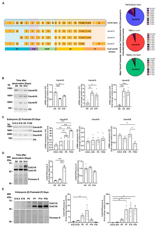 Identification of a new CaVβ1 isoform in embryonic muscles. (A) Cacnb1 gene and skeletal muscle transcript variants, Cacnb1A, Cacnb1D, and Cacnb1E, as well as the corresponding protein domains, are represented. Full-length sequencing of the Cacnb1 transcript through Nanopore technology led to the identification of one major isoform per TU. (B) RT-PCR and quantification of the three full-length Cacnb1 variants in innervated (D0) TA muscles or after 3 (D3) and 14 days of denervation. PO was the loading control. (C) Western Blot and quantification of CaVβ1A and CaVβ1D in embryonic (E) and post-natal (P) days. Ponceau S was the loading control. (D) Western Blot and quantification of CaVβ1A and CaVβ1D after 3 (D3) and 14 days of denervation. (E) Western Blot and quantification of CaVβ1A and CaVβ1D in embryonic (E) muscles and adult (P) TA muscles. Ponceau S was the loading control. All data are mean ± SEM (* p < 0.05, ** p < 0.01, and *** p < 0.001). p values were calculated by ordinary one-way ANOVA followed by (B–D) Tukey’s and (E) Dunnett’s multiple comparison tests.