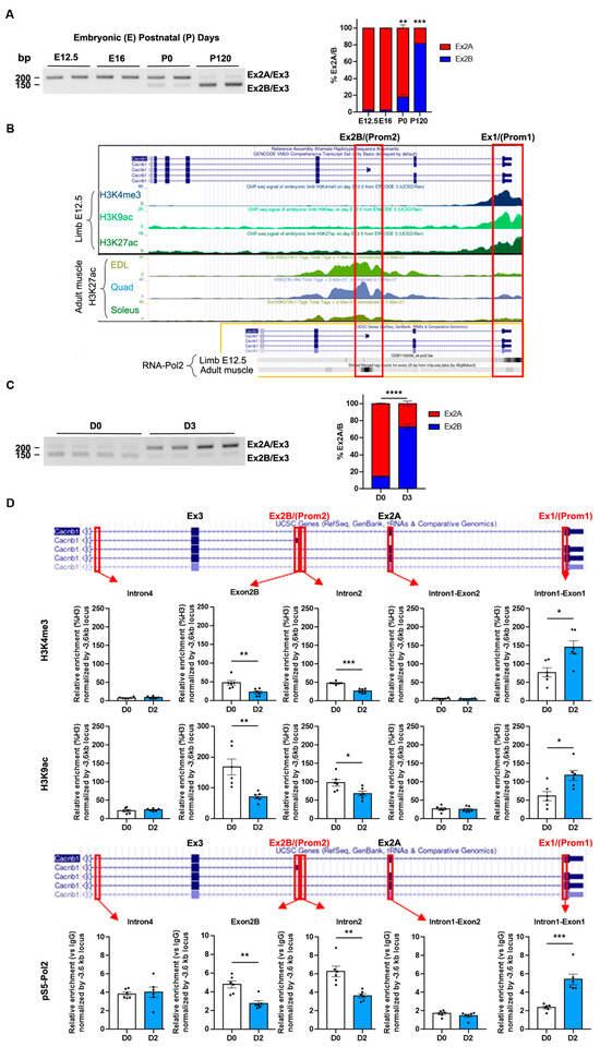 Two specific and distinct promoters drive the expression of Cacnb1 isoforms in skeletal muscle. (A) Triplex RT-PCR and quantification of the percentage of exon2A versus exon2B inclusion in embryonic (E) and adult (P) TA muscles. (B) Visualization of epigenetic marks and RNA Polymerase II at Cacnb1 promoters using UCSC Genome Browser. Image displaying the location of exon2B (Ex2B) containing the promoter site 2 (Prom2), exon1 (Ex1) containing the promoter site 1 (Prom1), activating epigenetic marks (H3K3me3, H3K9ac, and H3K27ac), and RNA Polymerase II occupancy at Prom1 and Prom2 in either embryonic (E12.5) muscles (ENCODE project) or adult muscles (Extensor digitorum longus (EDL), Quadriceps, and Soleus). (C) Triplex RT-PCR and quantification of the percentage of exon2A versus exon2B inclusion in innervated and 3-day denervated adult TA muscles (D3). (D) Chromatin immunoprecipitation (ChIP) followed by PCR analysis showing the presence of activating epigenetic marks (H3K4me3 and H3K9ac) and Serine5-phosphorylated RNA Polymerase II (pS5-Pol2) occupancy at Prom1 and Prom2 in innervated and 2-day denervated adult TA/Gas muscles. All data are mean ± SEM (* p < 0.05, ** p < 0.01, *** p < 0.001, and **** p < 0.0001). p values were calculated by ordinary two-way ANOVA followed by Tukey’s multiple comparison test (A), and Sidak’s multiple comparison test (C),or unpaired t-test (D).
