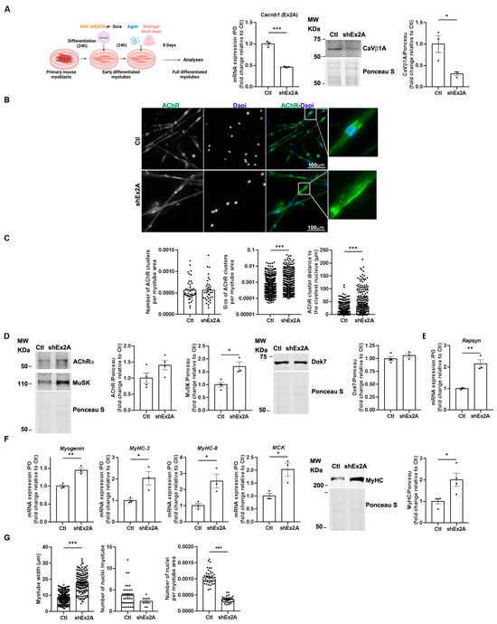 Downregulation of embryonic CaVβ1 isoforms induces bigger AChR aggregates and myotube precocious maturation in an in vitro model of highly differentiated myotubes. (A) Schematic representation of the experimental protocol. RT-qPCR of Cacnb1 exon2A (Ex2A), Western Blot, and quantification of CaVβ1A in the control (Ctl) and shEx2-treated myotubes. (B) Immunofluorescence (IF) images of the control or shEx2A-treated myotubes stained with AChRa1 (green) and DAPI (blue). (C) Quantification of AChR cluster number and size per myotube area and distance between AChR clusters and the nearest nuclei. (D) Western Blot and quantification of AChR, MuSK, and Dok7 in the control and shEx2A-treated myotubes. (E) RT-qPCR of Rapsyn in the control and shEx2A-treated myotubes. (F) RT-qPCR of Myogenin, MyHC-3, MyHC-8, and MCK in the control and shEx2A-treated myotubes and Western Blot and quantification of MyHC in the control and shEx2A-treated myotubes. (G) Quantification of the number of nuclei per myotube and number of nuclei per myotube in the control and shEx2A-treated myotubes. All data are mean ± SEM (* p < 0.05, ** p < 0.01, and *** p < 0.001). p values were calculated by an unpaired t-test (A–G).