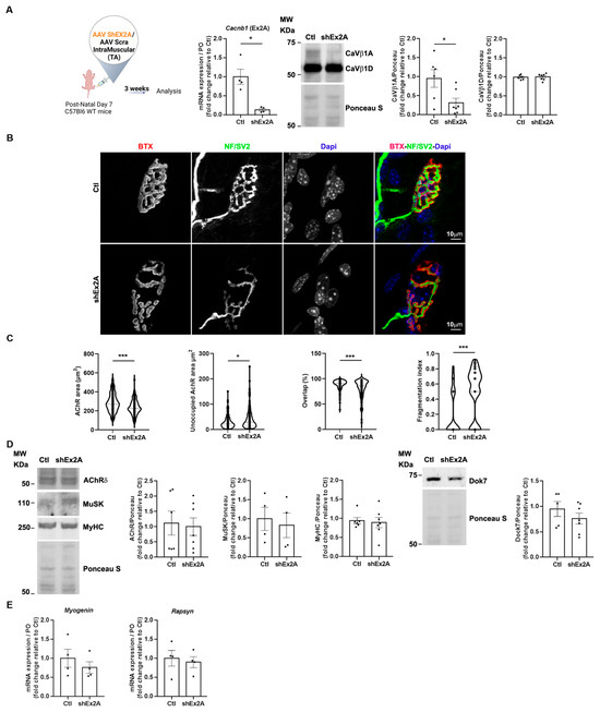 NMJ structural and molecular defects upon downregulation of embryonic CaVβ1 isoforms in TA muscles at post-natal stages. (A) Schematic representation of the experimental protocol. RT-qPCR of embryonic Cacnb1 variants using primer in exon2A in the control and shEx2-treated TA muscles, Western Blot, and quantification of CaVβ1A and CaVβ1D in muscles 3 weeks post-injection. (B) Immunofluorescence (IF) images of the control and shEx2A-treated TA muscles, 3 weeks post-injection, stained with α-bungarotoxin (BTX) for AChR (red), neurofilaments, and Synaptic Vesicle Glycoprotein 2 (NF/SV2) (green) and DAPI (blue). (C) Quantification of NMJ morphology with area of AChR, unoccupied AChR area, overlap between nerve terminals and postsynaptic apparatus, and fragmentation index. (D) Western Blot and quantification of AChRδ, MuSK, and MyHC in the control and shEx2A-treated TA muscles, 3 weeks post-injection. (E) RT-qPCR of Myogenin and Rapsyn in the control and shEx2A-treated muscles. All data are mean ± SEM (* p < 0.05, and *** p < 0.001). p values were calculated by paired (A—Cacnb1 RT-qPCR-, E) and unpaired t-tests (A—CaVβ1A and CaVβ1D WB-, C, D).