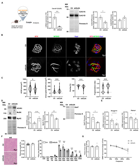 To better understand if CaVβ1A and CaVβ1E isoforms may play a role in the stabilization of nerve–muscle synapses once they are completely formed and mature, we disrupted their expression in the TA of adult mice via the AAV-shEx2A injection (Figure 5A). We then analyzed morphological, molecular, and functional readouts reflecting NMJ integrity 12 weeks post-injection. The quantification of pre- and postsynaptic morphological parameters revealed that the perimeters and areas of both AChR and endplates were significantly reduced upon embryonic Cacnb1 depletion compared to the controls. Additionally, the size of synaptic contact and the overlap between nerve terminals and the postsynaptic apparatus were decreased. Furthermore, a significant NMJ fragmentation was observed upon downregulation of embryonic CaVβ1 proteins (Figure 5B,C).