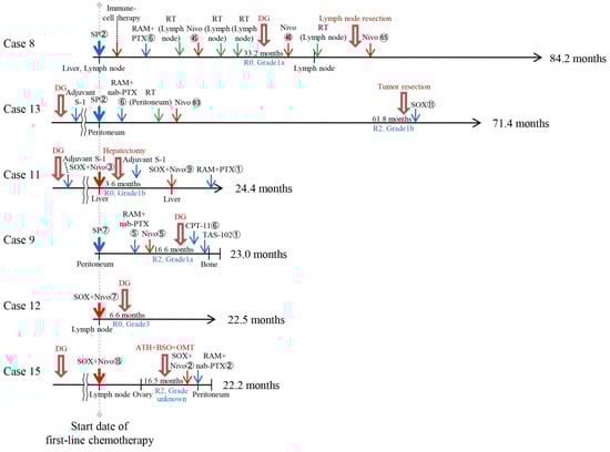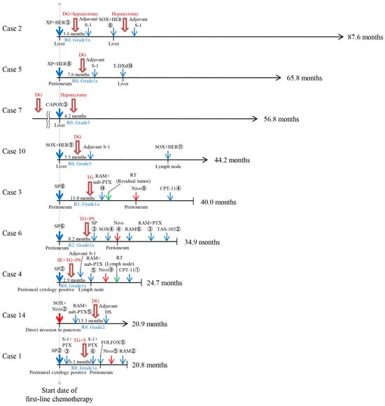 Clinical course of nine patients who underwent tumor resection after chemotherapy. The thick red arrow indicates the surgery. The blue, green, and red arrows indicate chemotherapy, radiotherapy, and immunotherapy, respectively. The numbers listed next to each regimen indicate the number of treatments. The locations of the metastatic tumors are listed below the horizontal axis. The period from the start date of first-line treatment with chemotherapy and/or anti-PD-1 therapy to tumor resection is shown on the horizontal axis. The overall survival is shown on the right side of the horizontal axis. The horizontal line of arrows indicates survivors. CAPOX—capecitabine-oxaliplatin; CPT-11—irinotecan; DG—distal gastrectomy; DS—Docetaxel-S-1; FOLFOX—oxaliplatin-5-fluorouracil-leucovorin-oxaliplatin; HER—trastuzumab; Nivo—nivolumab; PS—pancreato-splenectomy; PTX—paclitaxel; RAM—ramucirumab; RT—radiotherapy; S—splenectomy; SE—subtotal esophagectomy; SOX—S-1-oxaliplatin; SP—S-1-cisplatin; TAS-102—Trifluridine/tipiracil; T-DXd—Trastuzumab deruxtecan; TG—total gastrectomy; XP—capecitabine-cisplatin.