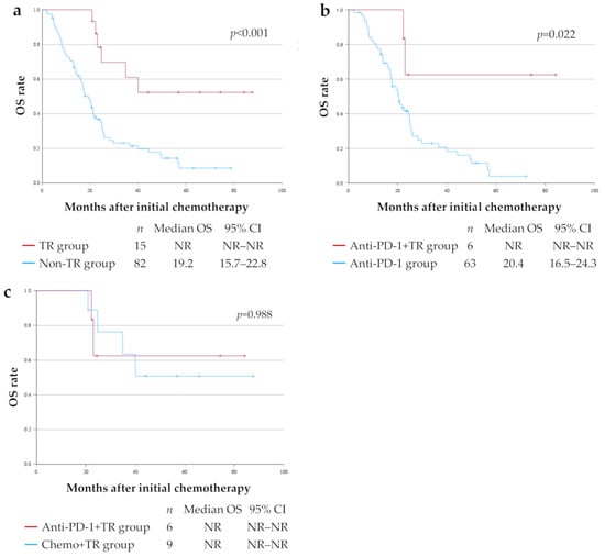 The 5-year OS rate for all 97 patients was 15.7% (median OS 21.2 months), with a median follow-up period of 20.5 months (range 1.8–87.5 months). The 5-year OS rates were 52.2% (median OS not reached) in the TR group (15 patients) and 8.5% (median OS 19.2 months) in the Non-TR group (82 patients), and the TR group had a significantly longer OS than the Non-TR group (p < 0.001) (Figure 3a). There were 63 patients in the Non-TR group who underwent anti-PD-1 therapy (Anti-PD-1 group) (Table 1). In addition, the 5-year OS rates were 62.5% (median OS not reached) in the Anti-PD-1+TR group (6 patients), and 3.8% (median OS: 20.4 months) in the Anti-PD-1 group (63 patients), and the Anti-PD-1+TR group had a significantly longer OS compared to the Anti-PD-1 group (p = 0.022) (Figure 3b). There was no significant difference in OS between the Anti-PD-1+TR group (six patients) and the Chemo+TR group (nine patients) (Figure 3c).