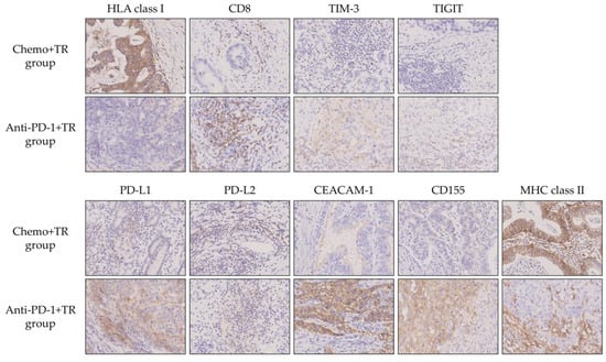 Representative IHC staining with HLA class I, CD8, TIM-3, TIGIT, PD-L1, PD-L2, CEACAM-1, CD155, and MHC class II in patients who underwent tumor resection (TR) after chemotherapy (Chemo+TR group) and those who underwent TR after anti-PD-1 therapy (Anti-PD-1+TR group). Original magnification ×400.