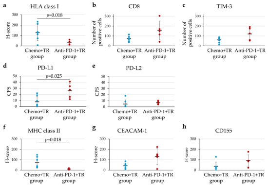Characteristics of tumor immune microenvironment in patients who underwent tumor resection (TR) after chemotherapy (Chemo+TR group) and those who underwent TR after anti-PD-1 therapy (Anti-PD-1+TR group). Dot plots showing the distribution of H-score, CPS or number of cells for HLA class I (a), CD8 (b), TIM-3 (c), PD-L1 (d), PD-L2 (e), MHC class II (f), CEACAM-1 (g), CD155 (h) expression evaluated by IHC using surgically resected specimens. Means of H-score, CPS, and number of cells are represented by the horizontal line, together with their error bars representing the standard deviation. Within each molecule category, every dot represents the evaluation of IHC staining in each case.