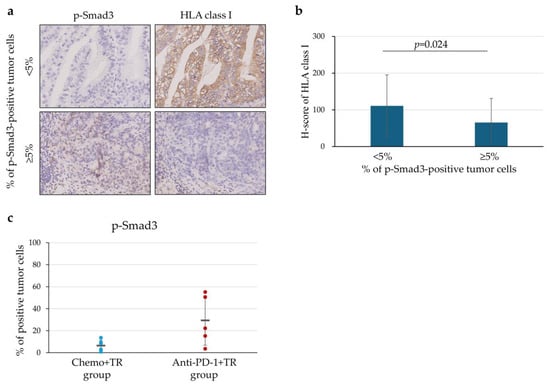 We analyzed the expression level of HLA class I on tumor cells in relation to p-Smad3 expression levels using serial tissue sections. Representative IHC staining images for p-Smad3 and HLA class I expressions in serial tissue sections are shown in Figure 6a. Compared to the group with <5% of p-Smad3-positive tumor cells (30 fields), the group with ≥5% (30 fields) showed significantly downregulated HLA class I expression on tumor cells (p = 0.024) (Figure 6b). The difference was not statistically significant between p-Smad3-positive tumor cells in the Anti-PD-1+TR group and the Chemo+TR group (Figure 6c).