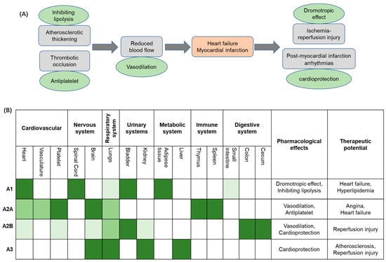 Briefly, the high expression of A1 receptors (A1Rs) in the heart is closely linked to their negative dromotropic effect, making them a potential therapeutic target for heart failure. In adipose tissue, A1R is also highly expressed; its ability to inhibit lipolysis suggests therapeutic value in hyperlipidemia. The high expression of A2A receptors (A2ARs) on platelets underpins their anti-platelet aggregation effect, which reduces thrombosis and consequently lowers the risk of heart failure. Differently, the presence of A2BR in human platelets is currently under debate and is probably of minor function [28,29]. A2AR is also relatively abundant in the heart, where its vasodilatory effects offer therapeutic potential for angina pectoris. Although the expression of A2B receptors (A2BR) in the heart is relatively low, they can still contribute to vasodilation and may thus play a role in the management of angina. The inhibition of A2BR and A3 receptors (A3R), despite their low expression levels in the cardiovascular system, has been shown to influence pro-inflammatory pathways that help mitigate cell death and tissue damage during ischemia-reperfusion injury.