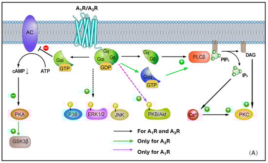 (A) Cell biology overview of A1R and A3R intracellular signalling pathways. (B) Cell biology overview of A2AR and A2BR intracellular signalling pathways.
