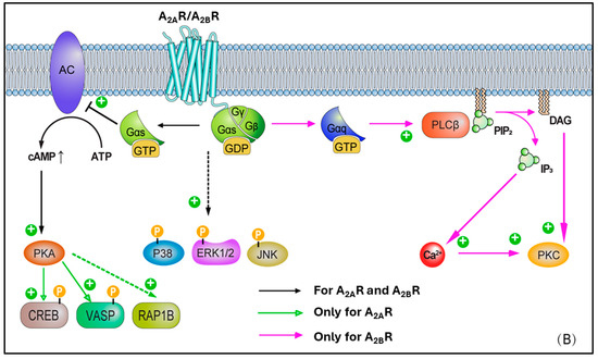 Differently to the other AR subtypes, A2B receptors (A2BRs) possess the least affinity for adenosine (in the micromolar range, e.g., 15–24 μM) [27]. However, this property may be selectively modulated by protein kinase C (PKC) signals [80]. High expression of A2BR is observed in the colon, bladder, and cecum, moderate expression is apparent in the eye and lungs, while low expression is found in the brain, kidney, and heart [81]. In smooth muscle, A2BR has been found to mediate vasodilation via Gs-stimulated adenylate cyclase (AC) activity, cAMP production, and PKA phosphorylation [82] (Figure 2B). A2BR can also activate phospholipase C-β (PLC-β) and increase Ca2+ ions intracellularly, in smooth muscle cells as well as in other cell types (e.g., vascular endothelial cells). Moreover, phosphorylated mitogen-activated protein kinases, p38, ERK 1/2, and JNK 1/2, resulting from A1R activation, are further activated following A2BR recruitment. In a similar fashion to A2AR, A2BR activation leads to vasodilation via nitric oxide and potassium ATP channels [81,83,84,85,86], in various cell types, including endothelial cells, ventricular myocytes, and vascular smooth muscle cells, although this appears to be produced to a lesser extent.